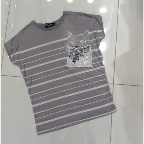 Футболка для девочки полоска Кошка MiniModa серый